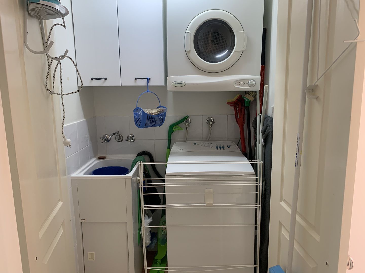A European laundry with washing machine, dryer and wash tub..